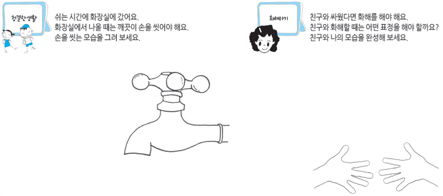 그림 그리기를 통해 ‘우리들은 1학년, 바른 생활, 슬기로운 생활, 즐거운 생활’ 등을 배우도록 구성했다. 이책을 통해 학교생활에 적응하도록 돕는 교과인 ‘우리들은 1학년’, 기본 생활 습관과 규범의 중요성 일러주는 ‘바른 생활’, 일상에서 겪을 수있는 문제를 빠르게 판단하고 해결하는 능력과 태도를 배우는 ‘슬기로운 생활’, 다양하고 즐거운 활동을 통해 어린이의 활동 욕구를 충족시킴으로써창의력을 길러 주는 ‘즐거운 생활’을 공부할 수 있다. 그 점을 인정받아 이 책은 ‘전국 초등학교 교과서 연구회’의 추천을 받기도 했다.